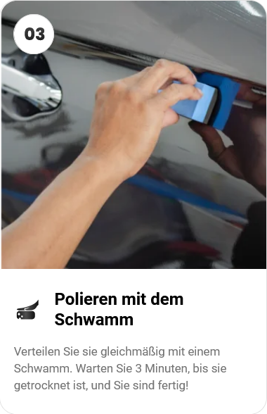 Die Anwendung von Nurafix ist unkompliziert und kann problemlos zu Hause durchgeführt werden. Mit nur wenigen Minuten Aufwand erzielen Sie Ergebnisse auf professionellem Niveau – ganz ohne teure Werkzeuge oder spezielles Fachwissen. Befolgen Sie diese drei einfachen Schritte, um die Oberfläche Ihres Fahrzeugs zu erneuern und zu schützen: